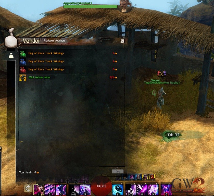 在之前龙击庆典中开放的恐鸟竞速小游戏一直保持到现在,通过竞速比赛的赌博你还能赢取到竞速兑换券,使用125个兑换就能换取一只迷你黄色恐鸟,当然你可以直接在拍卖行中购买这些兑换券(Race Track Vouchers),想要这只迷你黄色恐鸟玩家请抓紧时间了,因为虽然狮门逃亡补丁上线后,狮子拱门的重要功能NPC都会移往守夜人要塞,但是并不保证恐鸟竞速小游戏还会存在。