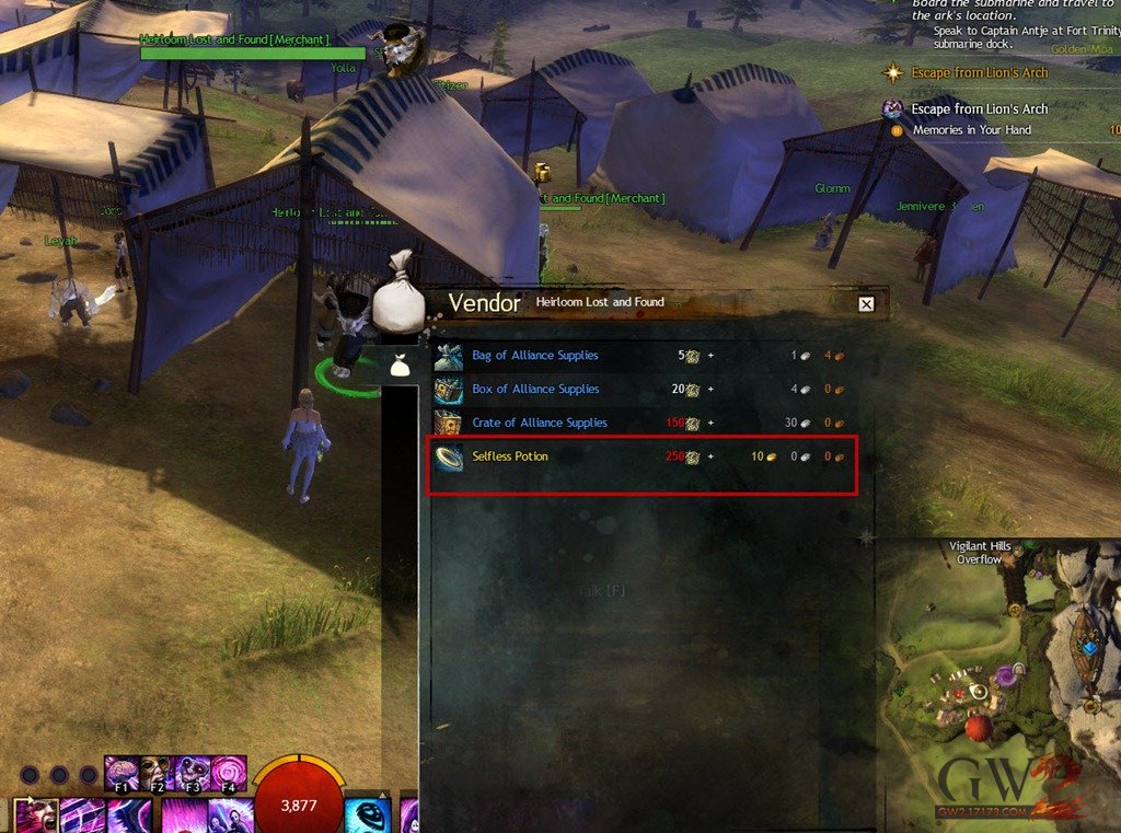 《激战2》狮门逃亡版本上线后增加了两种药水,使用药水后可以使人物角色的头部出现天使的光圈或者恶魔的角,你可以使用250个熔制传家宝(Found Heirlloom)和10金币换取这两种药水。