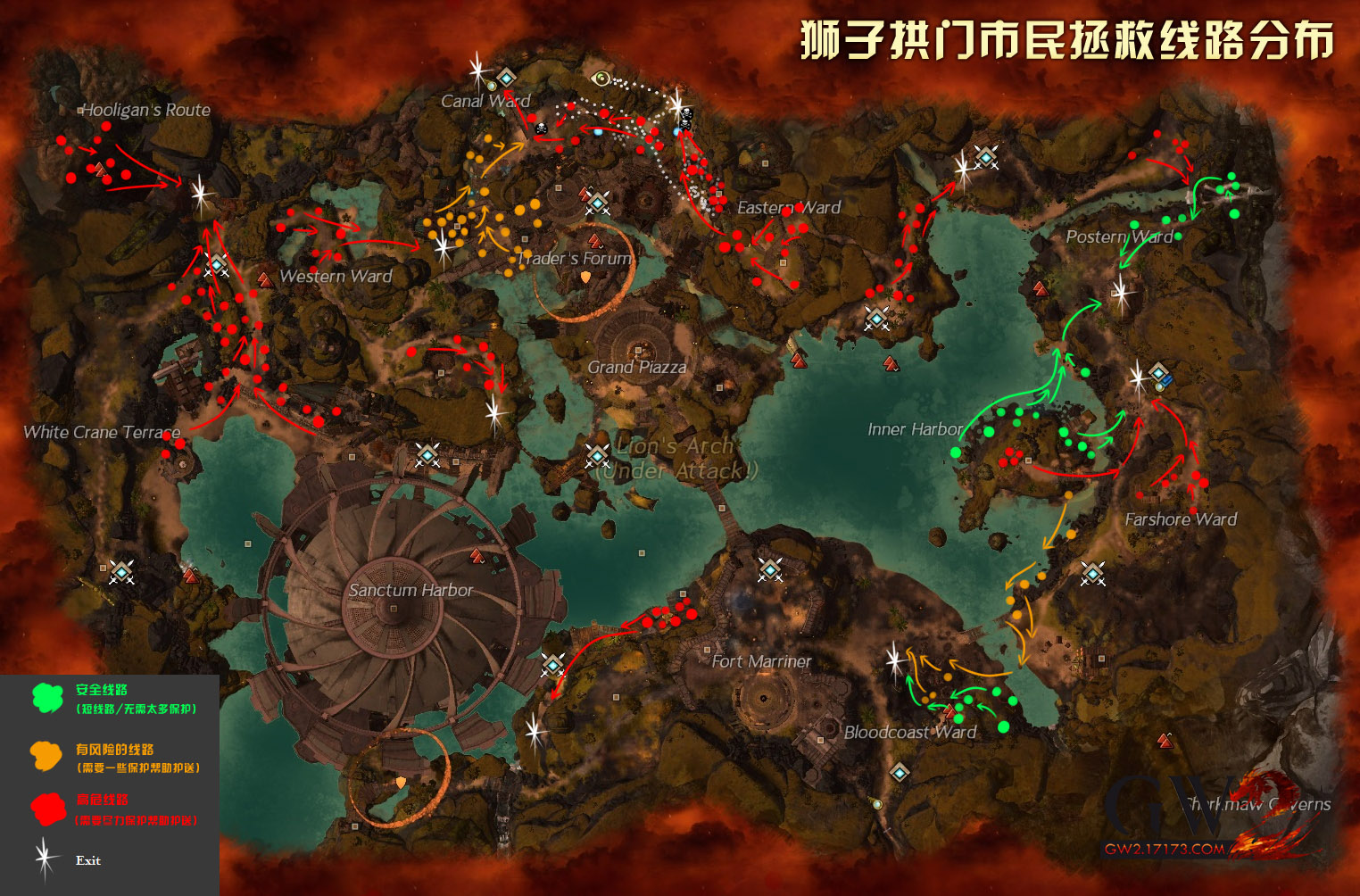 以下是激战2狮子拱门地图拯救市民线路的分布,这些点并非100%准确,但是是一个预估点,箭头是寻找撤退出口的线路。绿色和橙色线路基本上都能单人完成,而红色线路最好需要2-5人的小团队来进行,因为他们需要一定的保护市民。