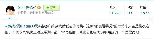 3月21日,公布买断制收费的《激战2》终于公布了国服价格,88元人民币的买断价格一经公布,立即引发了游戏业内人士与玩家的广泛争论。有不少人认为,《激战2》以一个大众都能接受的价格买断是游戏业内的一个创举;但同时,也有人认为,买断价格仅为88元,这种完全不符合中国游戏业国情的做法又靠什么挣钱呢?并对游戏未来的是否“有坑”表示出怀疑态度。