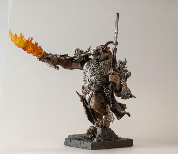 身穿银光色威风凛凛的铠甲,凶恶的獠牙,火红透明的火焰之剑,如同站在城堡前,带领着军队勇往直前。手办将夏尔这个好战种族展现得淋漓尽致,而金属的质感更加展现了手办整体美感。