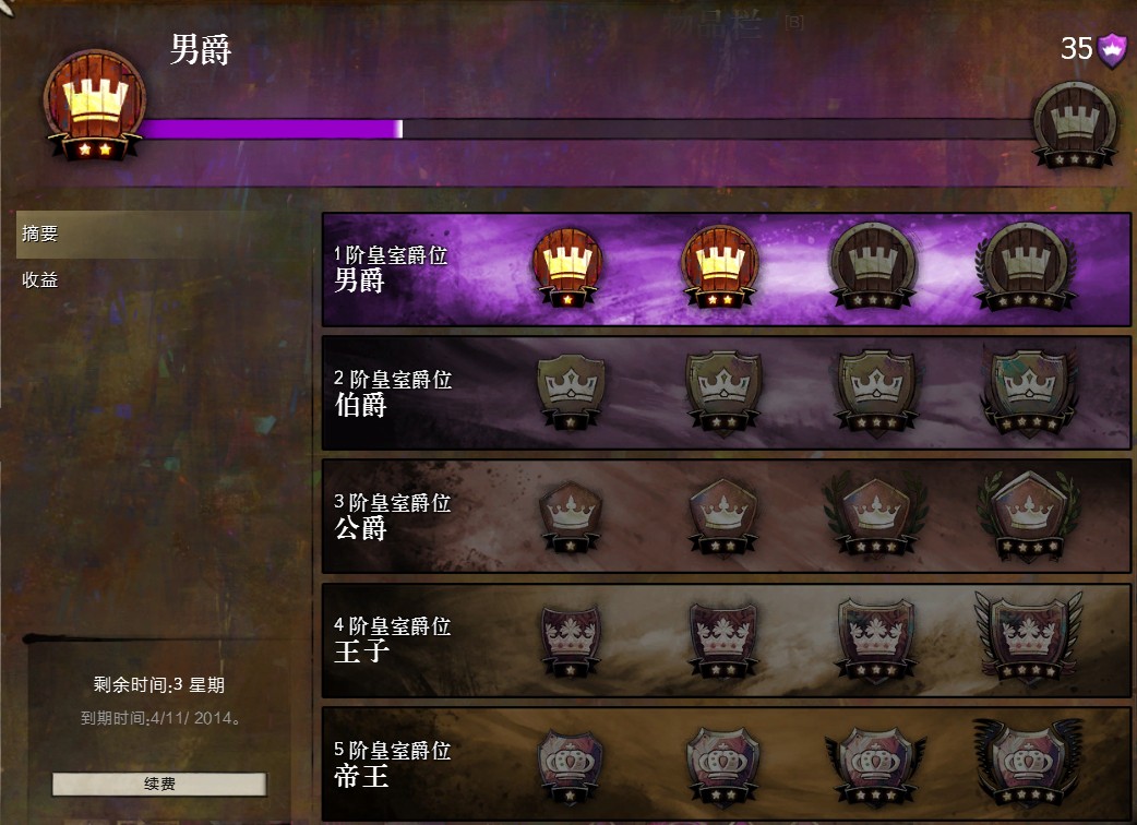 皇室爵位系统通过完成成就(日常任务)赚取点数来升级。(而不是加钱升级)