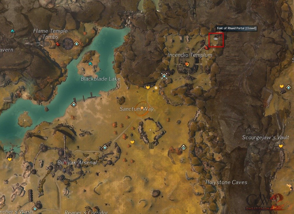 ·Rhendak the Crazed位于火焰神殿墓穴内,火焰神殿墓穴是一个迷你小副本,位于底耶沙高地(Diessa Plateau)。进入这个迷你副本前,你需要完成一系列的事件,这个系列事件发生在Incendio Templum区域附近,也是Font of Rhand入口传送门的位置。