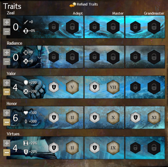 这种守护自身的回血能力是比较差的,但是由于点了最后一排特性点的IX - Absolute Resolution以及X - Indomitable Courage,这两点都是强化守护的美德技能,也就是使用F2可以移除自己跟队友三个症状并加强被动回血的效果,以及使用F3会给予自己以及周围盟友稳固的效果,并且被动格档的CD时间也缩短,使得这两个技能可以更有效的来帮助队友。