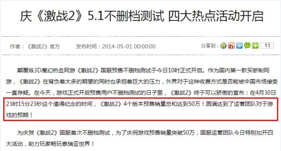 从超过50万的销量和至少20万的最高在线人数来看,《激战2》5月1日不删档测试已经取得了初步成功,空中网能否继续保持这一增长势头,还需要根据其在5月1日到5月15日期间的宣传策略和游戏运营情况进一步分析。
