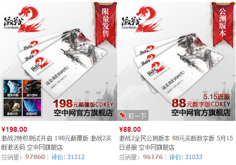 不删档测试开启四天后,天猫、京东、腾讯等线上渠道以及线下实体店的客户端销量仍在持续增长中,其中包含绝版道具的198元颠覆版和附赠手办画册的698元典藏版成为更多游戏核心玩家的选择。同时受到吉克隽逸录制《激战2》主题曲MV、《激战2》校园行、整点免费抢购CDkey等宣传攻势和优惠活动的影响,许多新玩家也选择购买了5月15日进入游戏的88元公测版CDkey。在线人数和销量的双重增长很可能持续到游戏公测前夕,并在公测当天再度形成一轮高潮。