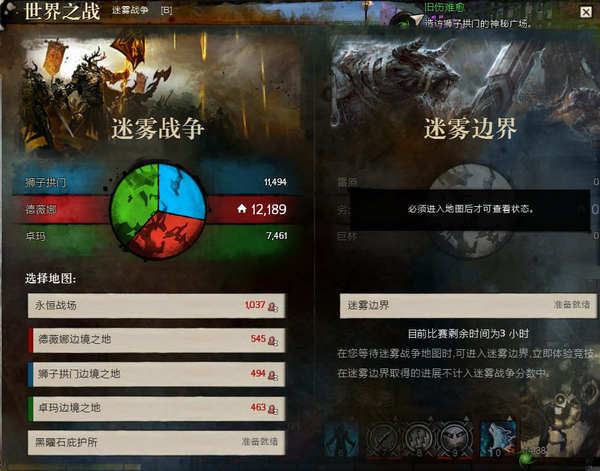 激战2世界战场迷雾战争界面是我们进入世界之战的面板,当然你也可以通过中立主城区域(现在是甘达拉战区守夜人营地)的传送门里进入世界之战。如果你已经参加了世界战场,那么你就可以通过快捷键B来打开世界之战界面,或者游戏界面左上方最后一个图标进入世界之战界面。