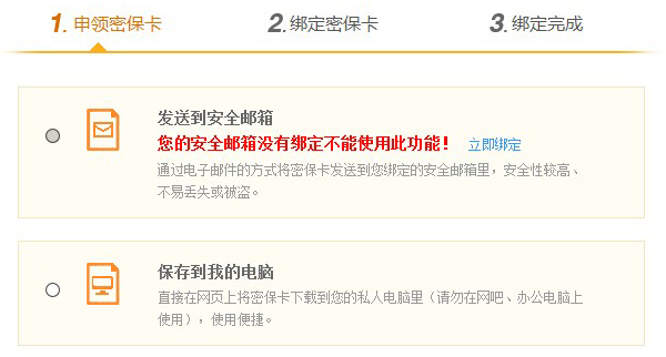 第四步:在未绑定过密保卡的用户,会弹出“申领密保卡”对话框。您可以选择将密保卡直接发送到邮箱,或者直接保存到电脑上。