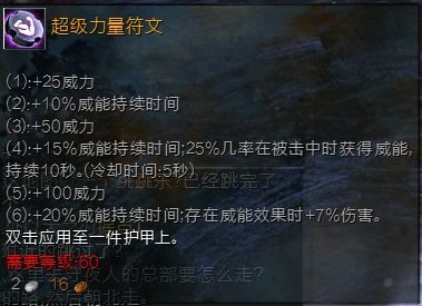 【在这里强烈推荐力量符文,目前版本的力量符文改得属性强到爆,加7%全伤,45%威能持续时间;】