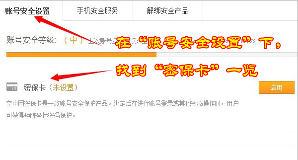 第三步:找到“账号安全设置”选项卡,里面有很多种设置。然后,选择“密保卡”点击右边的“启用”按钮。