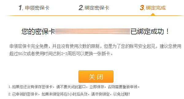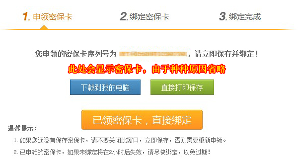 第六步:根据绑定提示,填入“密保卡”上的序列号和指定数字即可绑定成功。