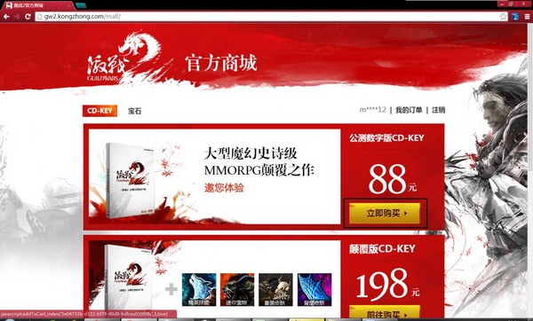 第三步:在激战2官方商城中,选择88元公测数字版,点击“立即购买”。如下图所示: