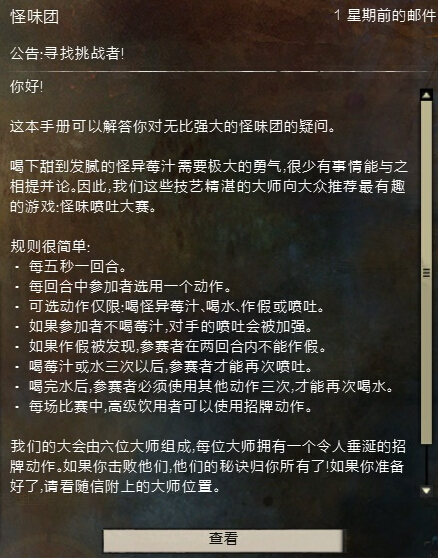 怪味喷吐是一项活动,玩家可以和NPC或者其他玩家对抗,目的是在“拼酒”比赛中先把对方的生命值归零。