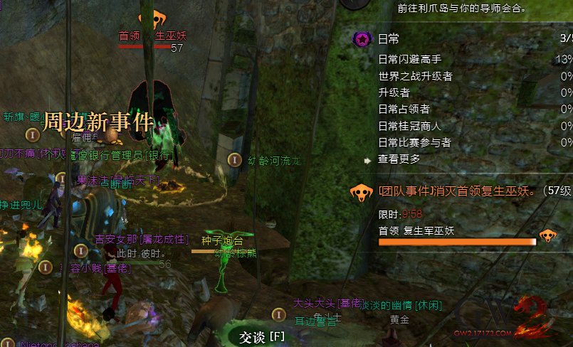 在等级升到50以后,玩家基本对整个游戏已经有了了解。如果不想慢慢探索做爱心任务跑地图,除了去Wvw战场,还可以选择加入暴民团来进行快速升级。