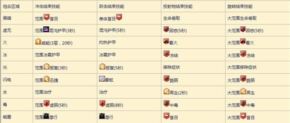 组合区域(combo field):或者称启动技能,是一种可以创造范围效果的技能。这些技能通常有一个容易辨认的元素或特点,这些元素或者特点决定了结束技与之相互作用后会产生何种效果。列如,一个适合的结束技穿过火墙会造成着火效果。只要相关的结束技能以及任何方向穿过此组合区域即可,例如,当组合区域出现时,一个投射物在空中穿过此区域即可造成组合技能。