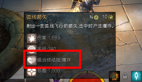 投射物结束技(Projectile finisher):弓箭类,或对目标敌人,或对邻近目标的盟友产生效果,单体。(常见的投射物技能会标示出每次攻击有20%的几率产生效果,而未标示的则为100%)