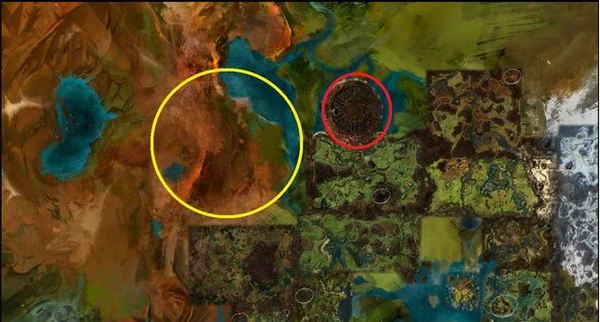 从右到左: Lion's Arch (狮子拱门)> Thaumanova Reactor (魔法反应炉) > 荒凉的岩地 > 迷之远古森林