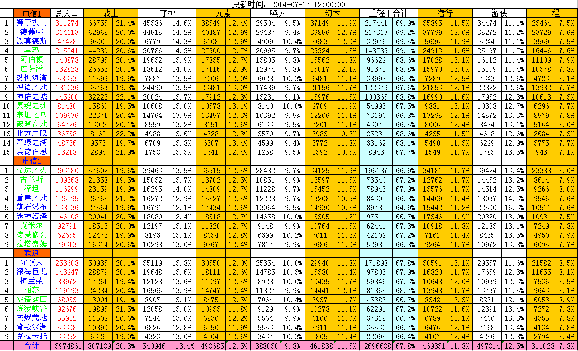 今日贴吧网友“zwkjn ”发表了一张激战2开服至今的人口普查帖【7月17号人口普查整理数据】。
