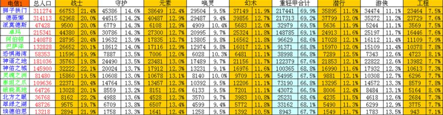 至今,三大区,前后一共开了33组服务器,德薇娜与狮子拱门作为电信区的最大服务器,总人口数分别为314113 和311274 占全人口数近七分之一,其中战士角色占20%,守护者占比14%,成为电信1区最大的两组服务器,除此之外卓玛人口数315341成为电信一区服务器排名第三。