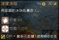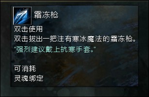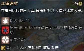 3、冰枪:双击拿出一把霜冻枪,替换武器技能,可以使用十次。此枪和元素召唤出的武器有点相类似之处,伤害比冰弓低了很多,不过在控制效果上面确实十分的强力,技能大多数是减速、流血和冰冻技能,当作控制技能来用到时十分的强力,具体效用还有待开发,目前还未明确。