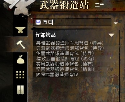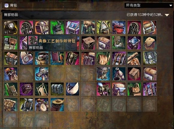 首先说制作,作为一个成就党我强烈建议你把8个制作都至少冲到400,省时省力还有很多好处,除去成就点不说,平日制作东西也方便极了!(例如现在世界动态的2种肥料,每天做一次都能白挣15J呢~)。我是4个不同的角色分别学了2种不同的制作,这些免得切来切去比较麻烦。如果你想要买配方的时候省下一些业力,那么应该猎手/工艺/武器锻造让同一个角色学,裁缝/盔甲锻造/制皮让另一个角色学。在冲制作过程中能学会不同阶段的武器/防具皮肤制作,这时候就最好留个心眼,把一套的皮肤都做出来解锁了。此外每个制作还有6个不同的背包皮肤,一共48种。如下图所示,武器锻造可以制作的6种背包皮肤,以及一共48种的副职背包皮肤一览。