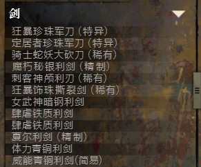 武器:青铜、铁质、暗钢、秘银、蛇妖、珍珠、古董(粉武)。