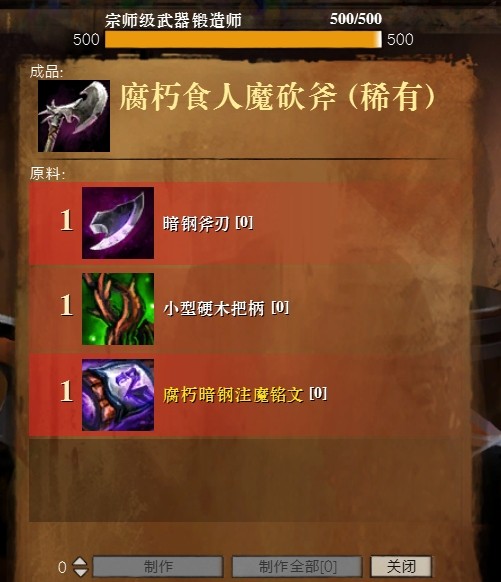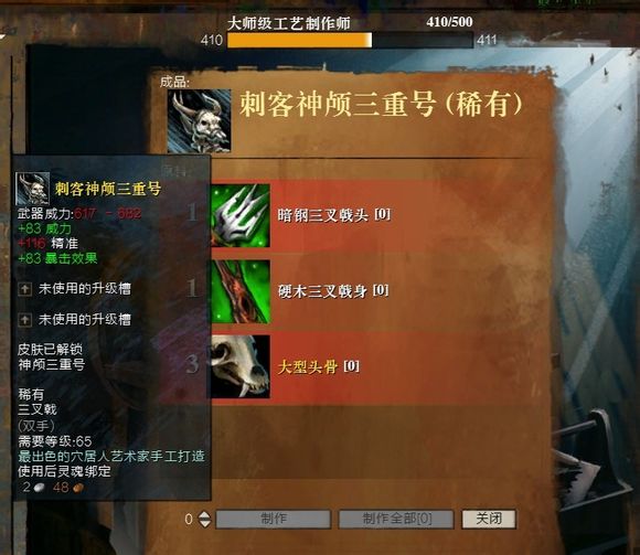 需要对应的275级武器、猎手、工艺制作,配方是相应的暗钢、硬木组件+大型头骨X3。