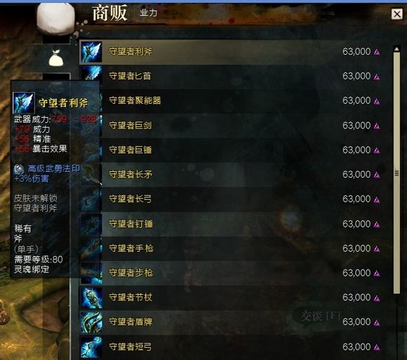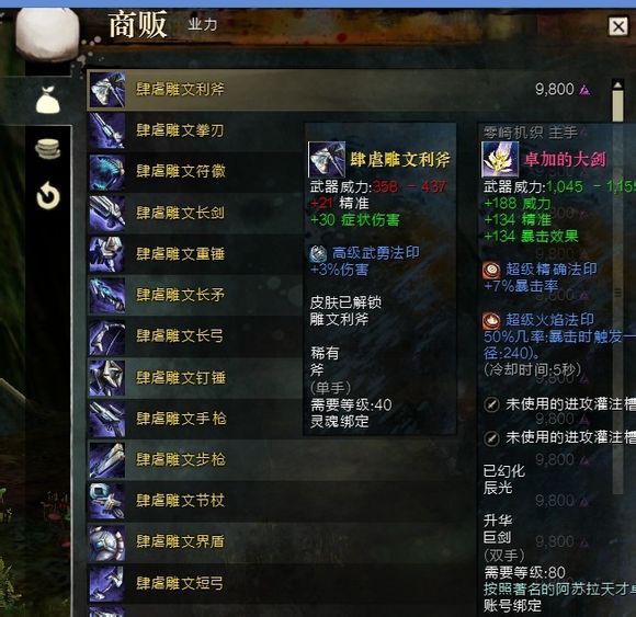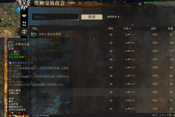 (武器)其他80级特异武器,可以从比较便宜的水下武器、副手武器、以及节杖,钉锤,长短弓,长短枪等等……(交易行买的建议挑符文、法印价格和物品价格差距不大的,买回来用黑狮拆解,卖了符文法印还能回本……)。