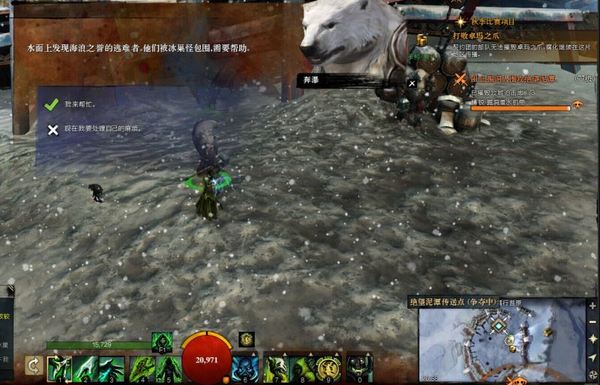 4种饮料都需要完成前置事件才能购买,其中最简单的是位于霜谷之音北侧的小瓶装回收啤酒。此事件不需要前置事件触发,单人即可完成,并且事件刷新很快。只需要去北侧海浪之寓门口不断救水里的死熊就行了。一定数量的遇难者成功上岸后任务完成,不需要打boss,也不需要做其他事件。