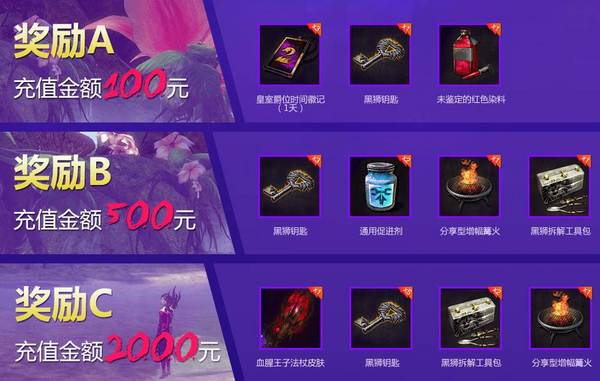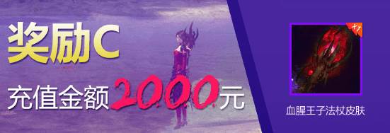 充值2000元,赠送:血腥王子法杖皮肤*1、黑狮钥匙*5、黑狮拆解工具包*2、分享型增幅篝火*1