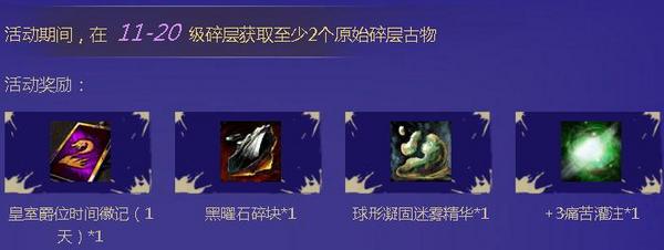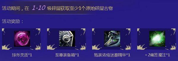 活动期间,在1-10级碎层获取至少1个原始碎层古物活动奖励: