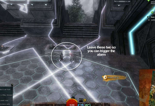 目标-在该副本中不要被发现,如果你站在魔像的橙色警戒区内就会被发现,在阿苏拉的白色警戒区内,如果你没有潜行就会被发现