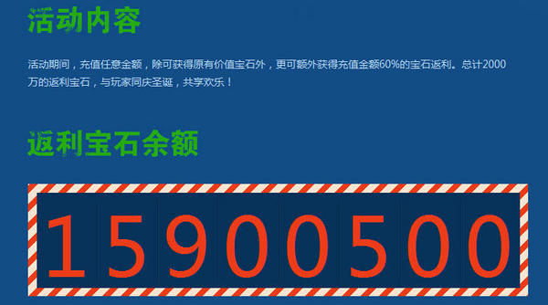 自12月24日开始,当返利宝石全部返还后,活动自动结束期间,充值任意金额,除可获得原有价值宝石外,更可额外获得充值金额60%的宝石返利。总计2000万的返利宝石,与玩家同庆圣诞。