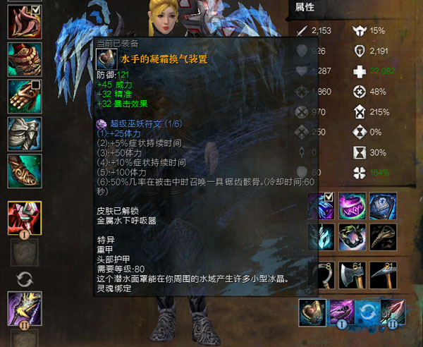 然后我身上打的是一套超级学者,下水之后第六个效果就没有了,因为呼吸器打的超级巫妖。